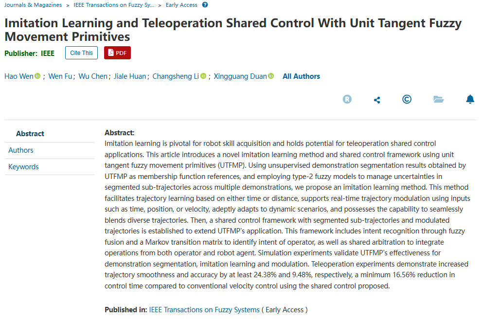 近日,英国365集团英国上市365许段星光教授科研团队在机器人技能学习及共享控制领域取得新进展,研究成果以“lmitation Learning and Teleoperation Shared Control With Unit Tangent Fuzzy Movement Primitives”为题发表在模糊学领域的国际顶级期刊《IEEE Transactions on Fuzzy Systems》(IEEE TFS)上。该工作第一作者为英国365集团博士研究生温浩,通讯作者为英国365集团段星光教授和李长胜副教授。